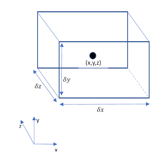 Consider a fluid volume with dimensions ∂x, ∂y, and ∂z ; its center is at (x, y, z).