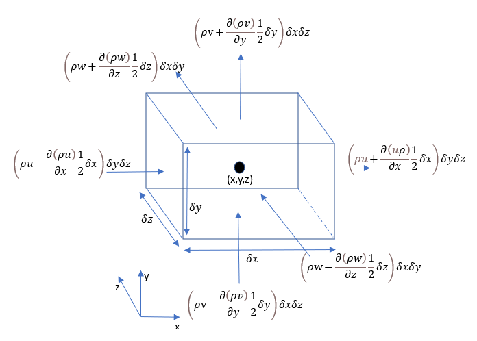 ∂t∂ρ∂x∂y∂z=−∂x∂(ρu)∂x∂y∂z−∂y∂(ρv)∂x∂y∂z−∂z∂(ρw)∂x∂y∂z