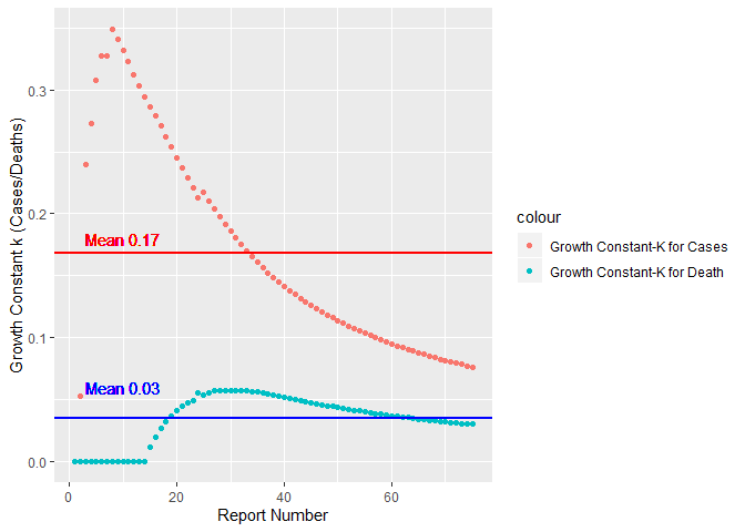 Exponential Growth constant ‘k’ for total deaths: 0.03/day (World-0.04/day) - Current values are less than the average.