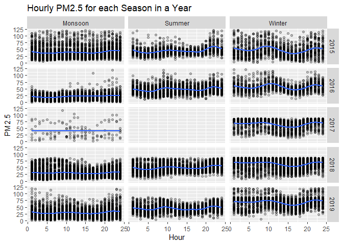 The below plot gird shows the year-wise details of hourly PM2.5 levels for different seasons.The blue line across each plot indicates Smoothed conditional means.