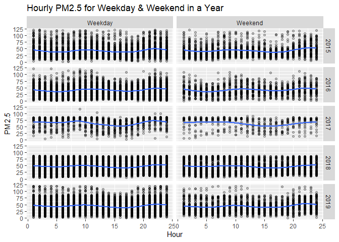 The below plot grid shows the hourly PM2.5 levels for weekdays and weekends. The blue line across each plot indicates Smoothed conditional means.