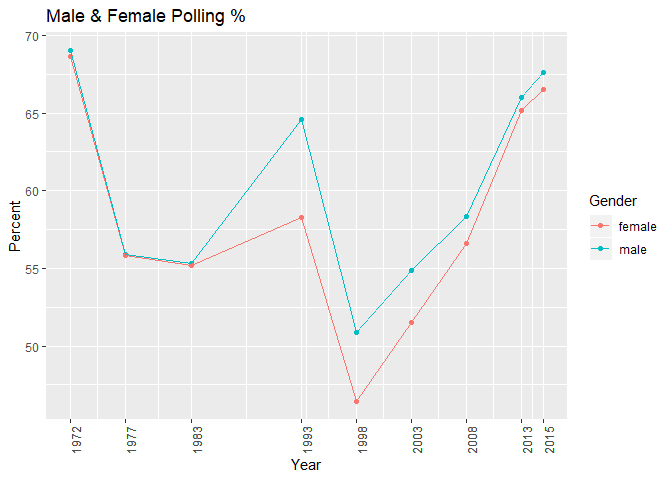 1951 male/female voting values are not available; hence we have taken data from the year 1972. The below line chart clearly shows that the male & female voting percentage is travelling parallel to each other. Always female voting percentage is slightly lesser than the male voting percentage.