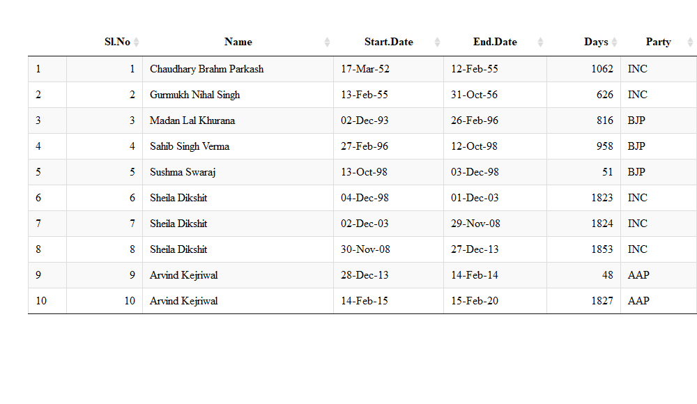 The below table shows the list of chief ministers of Delhi with starting date, end date, number of days in the post and party name.
