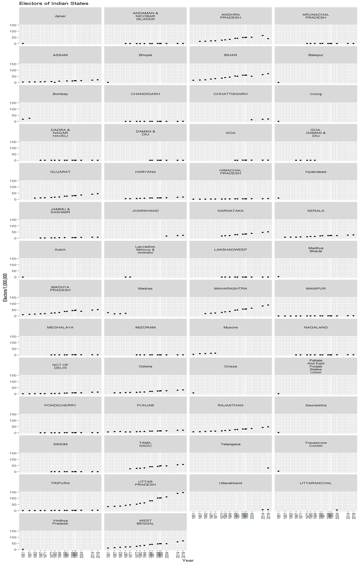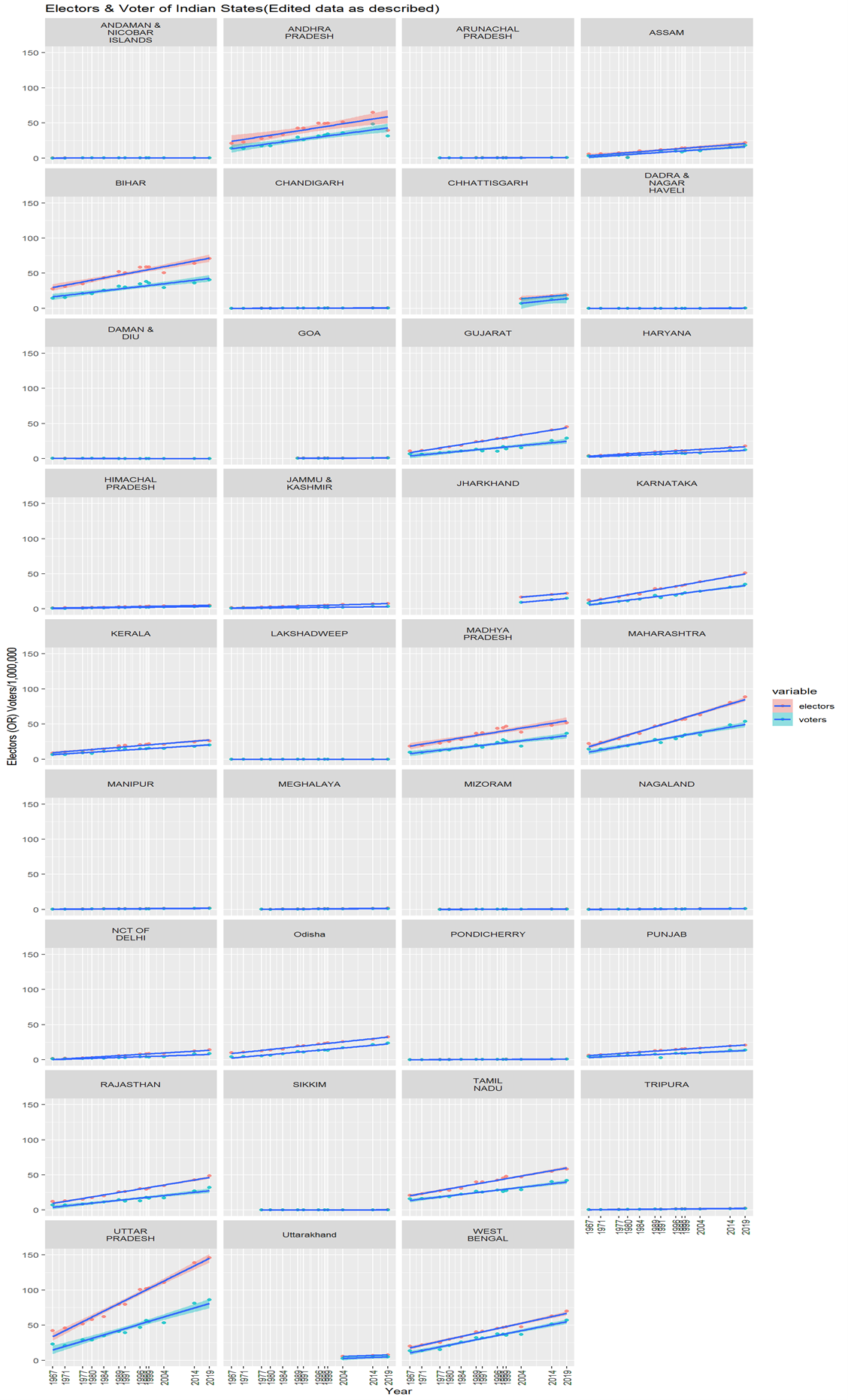 The below plot is made from the data of state-wise total electors in various parliamentary elections published by the election commission of India. The below plot has