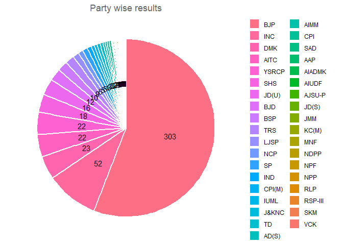 This election resulted in a single strong majority government established by Bharatiya Janata Party (BJP), under the leadership of Narendra Modi. The detailed results are shown in the below tables & above PI charts.