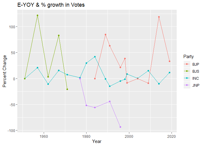 This chart is plotted only for major parties in India. BJP was preceded by BJS, PSP, SWA, JNP & NCO (or) some of these parties were merged with BJP, so BJP data should be looked with these parties in heed for better understanding.