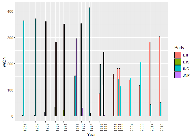 BJP was preceded by BJS(1951-1977) & JNP (1977-1980), the data of BJS & JNP should be considered as BJP for better understanding.