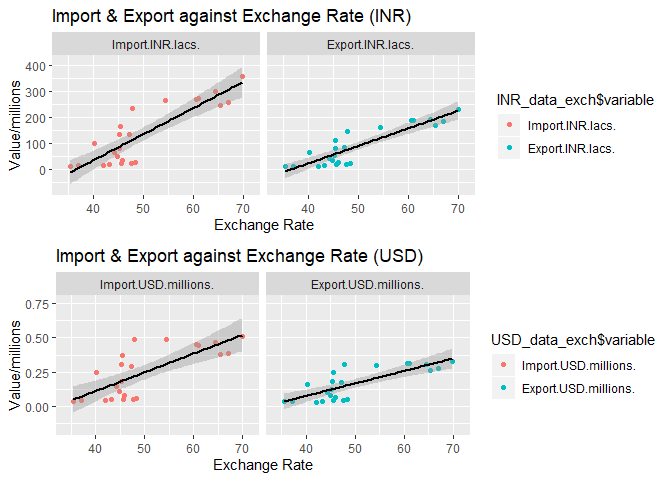 கீழே உள்ள புள்ளி விளக்கப்படம் வெளிநாட்டு நாணய மாற்று வீதத்திற்கு எதிரான இறக்குமதி, ஏற்றுமதி மதிப்பை காட்டுகிறது. INR & USD மதிப்புகளுக்கு தனித்தனி வரைபடங்கள் கொடுக்கப்பட்டுள்ளன. நடைமுறையில் இந்த நிலைமை சாத்தியமில்லை.