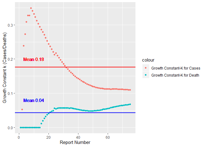 மொத்த இறப்பின் சராசரி “அதிவேக வளர்ச்சி மாறிலி” ‘k’ : 0.04/நாள்