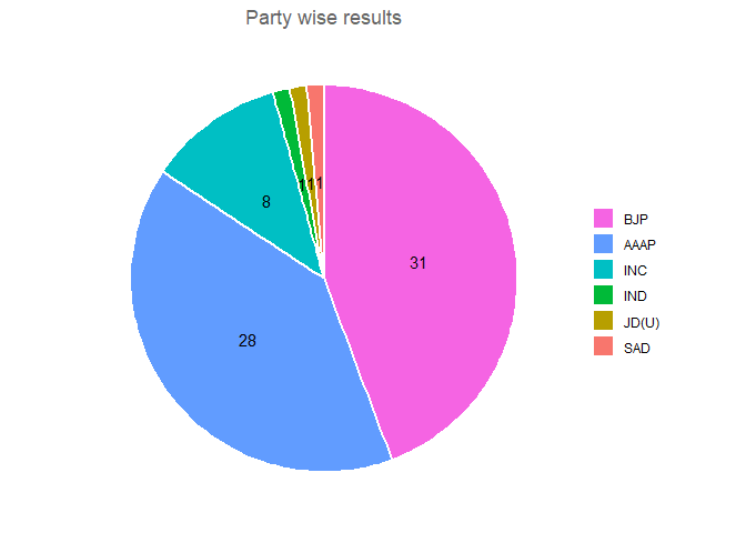 ஒவ்வொரு அரசியல் கட்சிக்கும் கிடைத்த வெற்றிகளின் எண்ணிக்கையை கீழே உள்ள பை விளக்கப்படம் காட்டுகிறது.