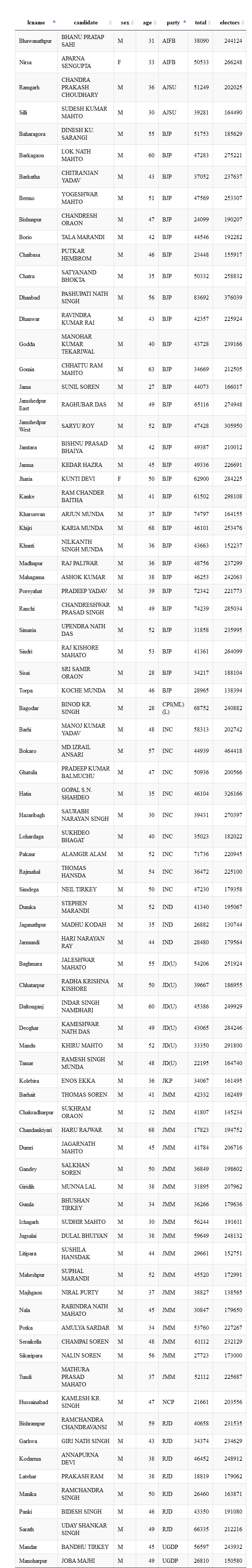 *.CSV வடிவத்தில் தகவல்களை ஜார்க்கண்ட் 2005 சட்டமன்றத் தேர்தல் இலிருந்து பதிவிறக்கம் செய்யலாம்
