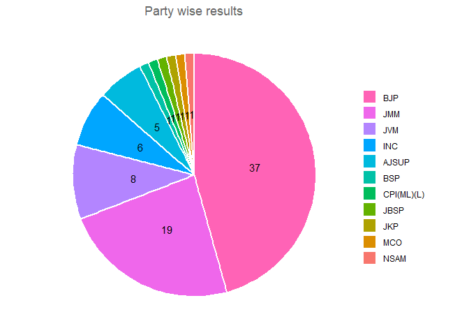 பாரதிய ஜனதா (BJP) 43 இடங்களுடன் பெரும்பான்மையை பெற்றது. ஜார்க்கண்ட் சட்டமன்றத்தில் பெரும்பான்மை அரசு அமைக்க 41 இடங்கள் தேவை.
