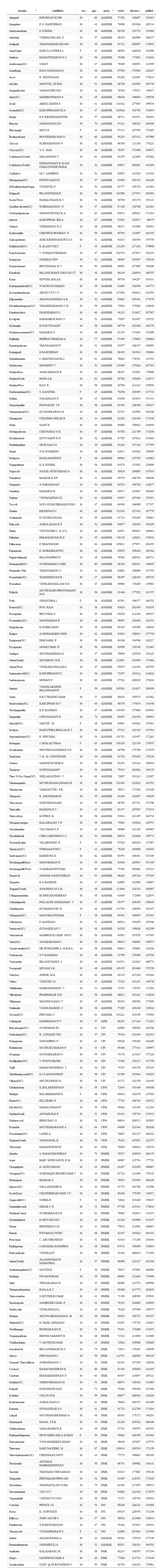*.CSV வடிவத்தில் தகவல்களை தமிழ்நாடு 2011 சட்டமன்றத் தேர்தல் இலிருந்து பதிவிறக்கம் செய்யலாம்